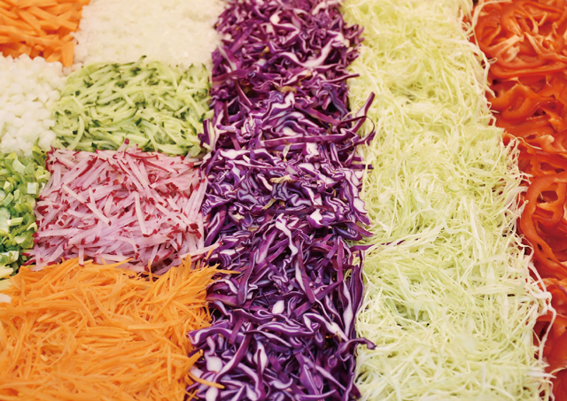 ①千葉市地方卸売市場内に工場があるため、契約農家をはじめ全国各地からの安心・安全なとれたて野菜を使用しカット野菜の製造を行う。